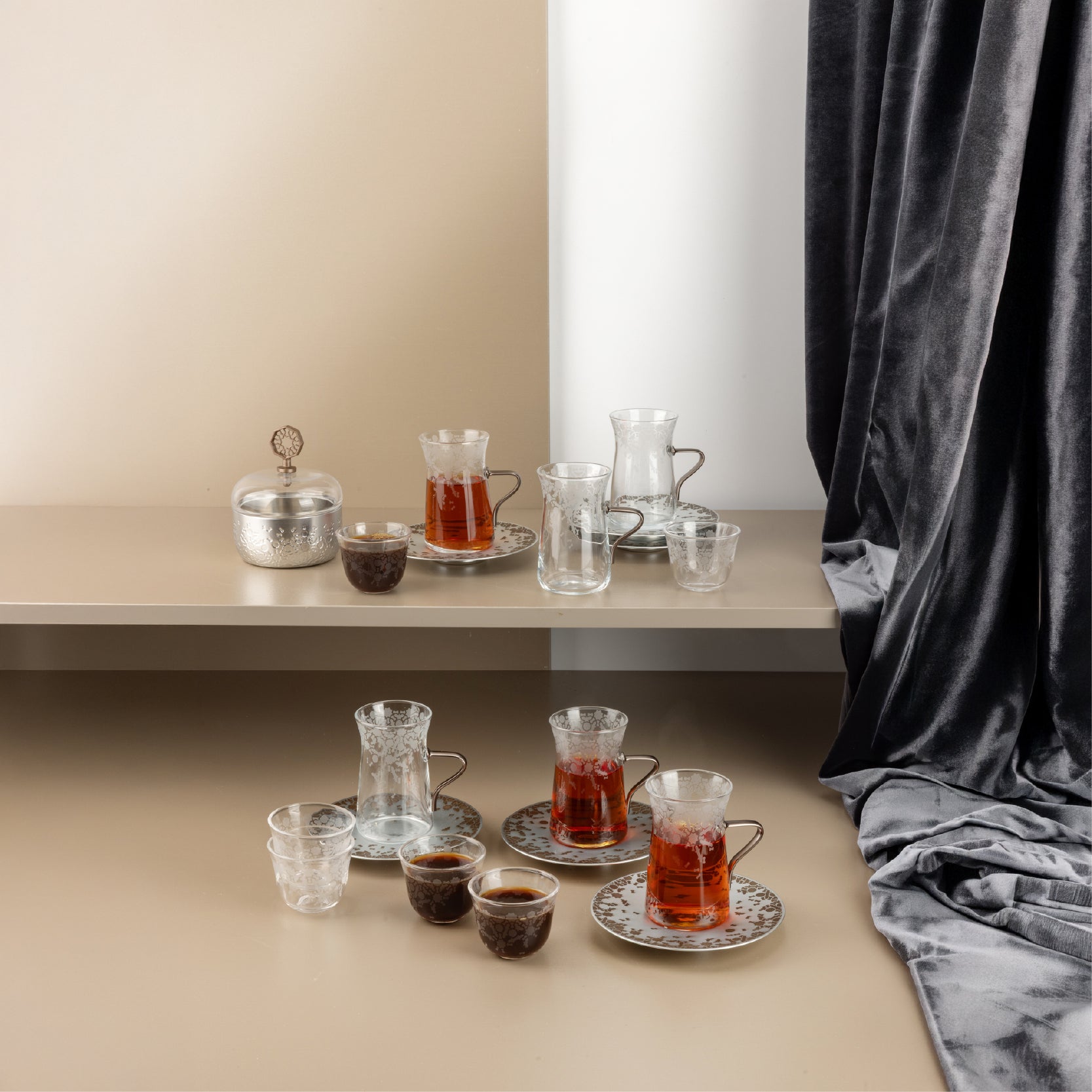 طقم الشاي والقهوة مكون من 6 أستكانات و6 فناجين قهوة عربية وسكرية